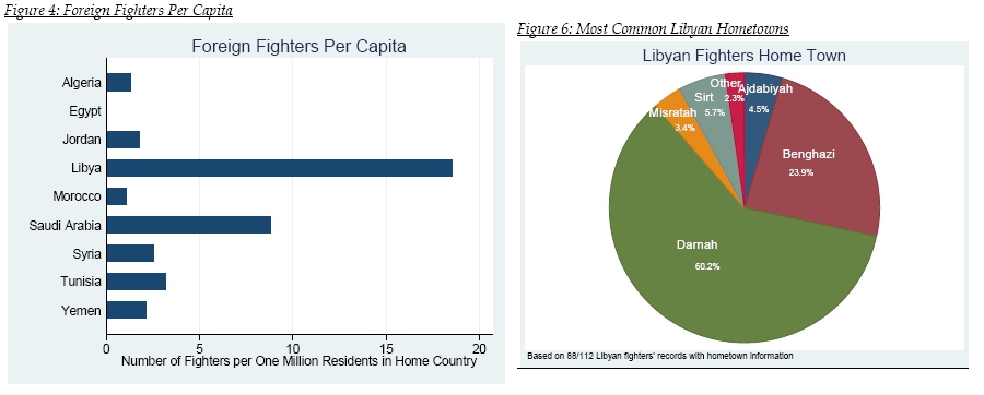 Image: Taken from a US West Point study, these graphs created by data obtained in Iraq clearly show that Libya’s eastern region, and the cities of Darnah and Benghazi in particular, provided by far more militants found fighting US troops in Iraq than any other nation, including Saudi Arabia. An apt summary of the report can be found at Tarpley.net. (click image to enlarge)